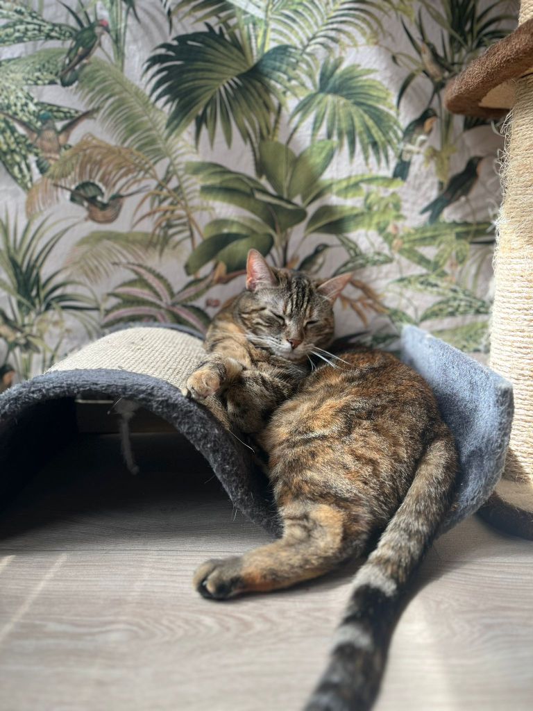 Wie al eens voorbij Poescafé gelopen is, heeft Lucy misschien al in actie gezien. Onze Lucy verwelkomt onze klanten namelijk met een rondje lopen in haar kattenwiel! Na deze kleine show gaat ze rustig liggen om van de aandacht en aaitjes te genieten. Een schootligger is het niet, maar spelletjes met de hengels kan ze zeker ook waarderen. We kregen Lizzie en Lucy ter adoptie van een koppel dat met veel spijt in het hart afscheid van hen moest nemen.