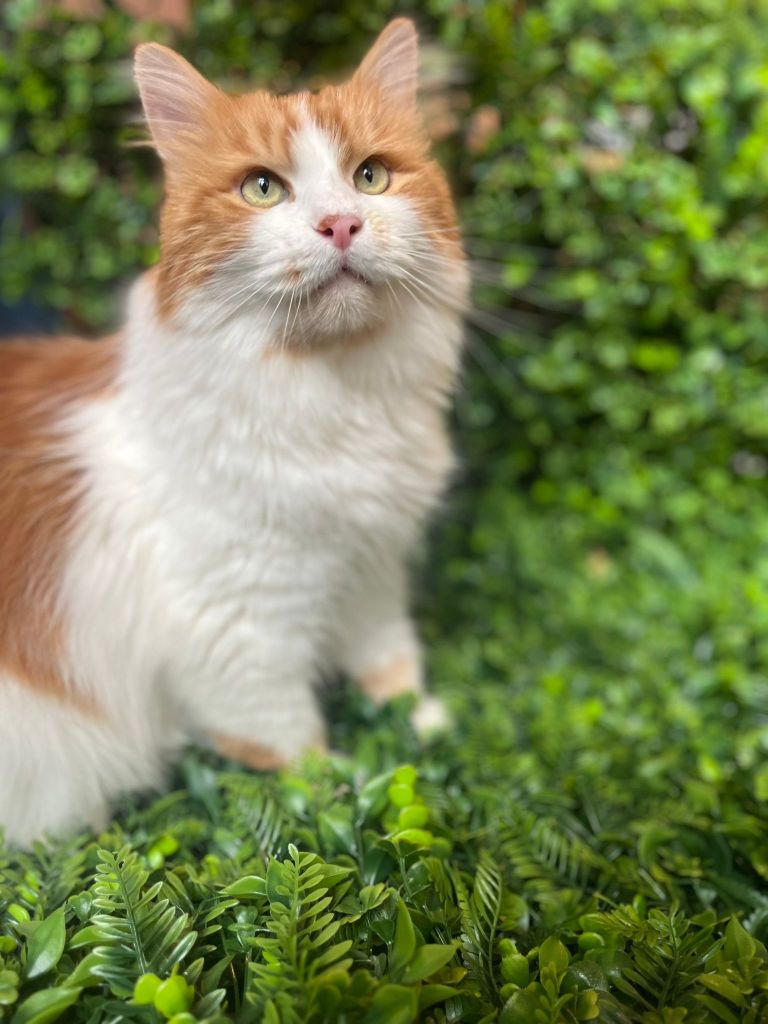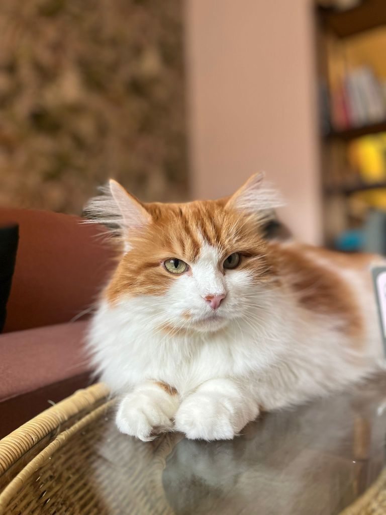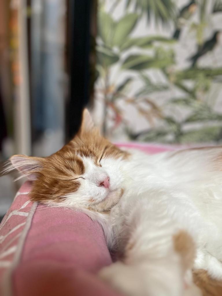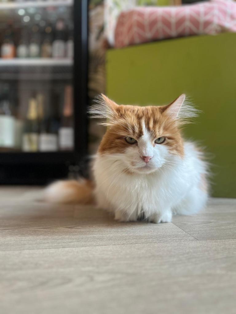 Bowie is de enige kater in Poescafé én onze nieuwste aanwinst. Hij is vaak de eerste om onze bezoekers te begroeten met zijn luide, maar vriendelijke miauw. Zijn pluizige vacht en lieve snoet nodigen heel erg uit van hem te aaien. Gelukkig geeft hij duidelijk aan wanneer hij aandacht wil! Ook zijn vacht verzorgen laat hij heel flink doen. Zijn schoonheidsslaapjes doet hij op zijn vaste plekje, van waaruit hij de mensen ook goed in het oog kan houden!